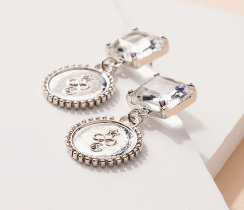 Moon and star detailed coin dangling earrings with square glass stone post.
